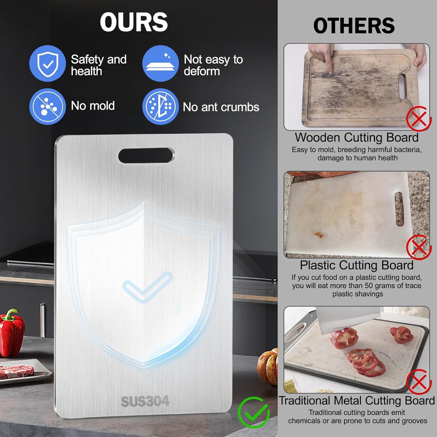 Dés sa première utilisation, les découpes répétées endommagent le bois, créant une surface favorable à la prolifération des germes et des bactéries invisibles à l’oeil. En plus, il :